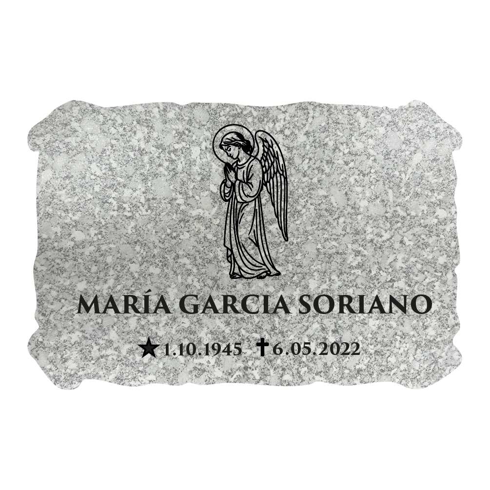 Cada placa puede personalizarse con el nombre del difunto, las fechas de nacimiento y defunción y una dedicatoria breve, e incluye el dibujo de un ángel, ya integrado en el diseño. La inscripción no se imprime ni se adhiere, sino que se graba directamente en el material, lo que garantiza su permanencia con el paso del tiempo, sin riesgo de desgaste o borrado. Esta placa de nicho está diseñada para resistir la intemperie: es impermeable, no se decolora y soporta bien el sol y la humedad.