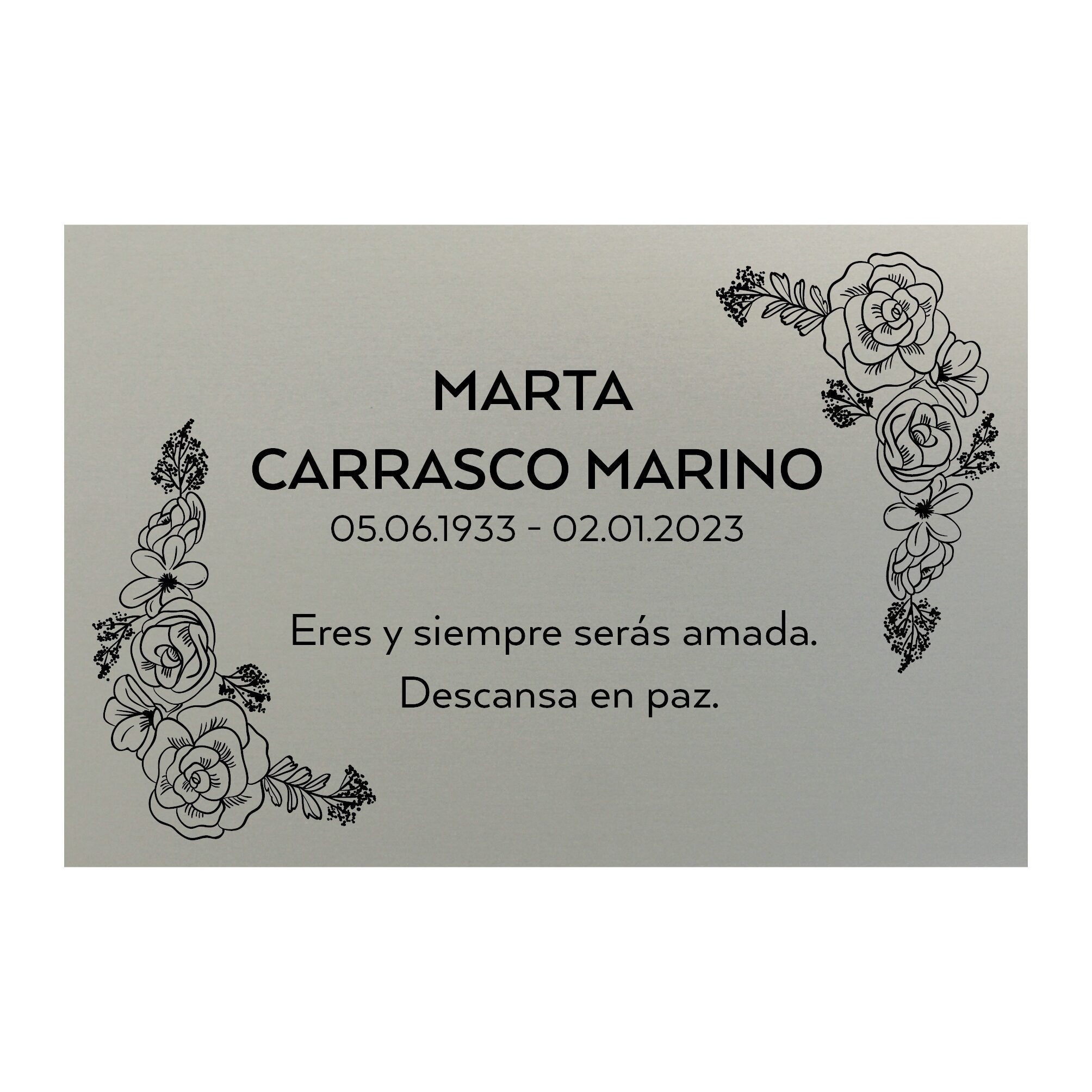 Placa recordatoria para colocar en la lápida de tus difuntos. Impresión resistente a las condiciones climatológicas apta para estar en el exterior. Impresión sobre aluminio anonizado.