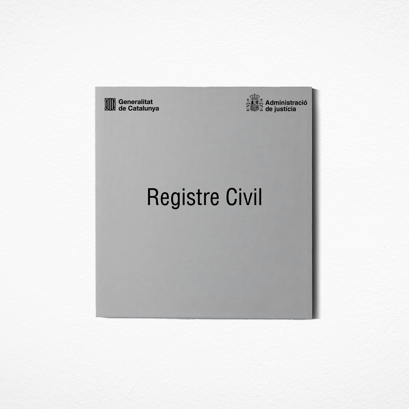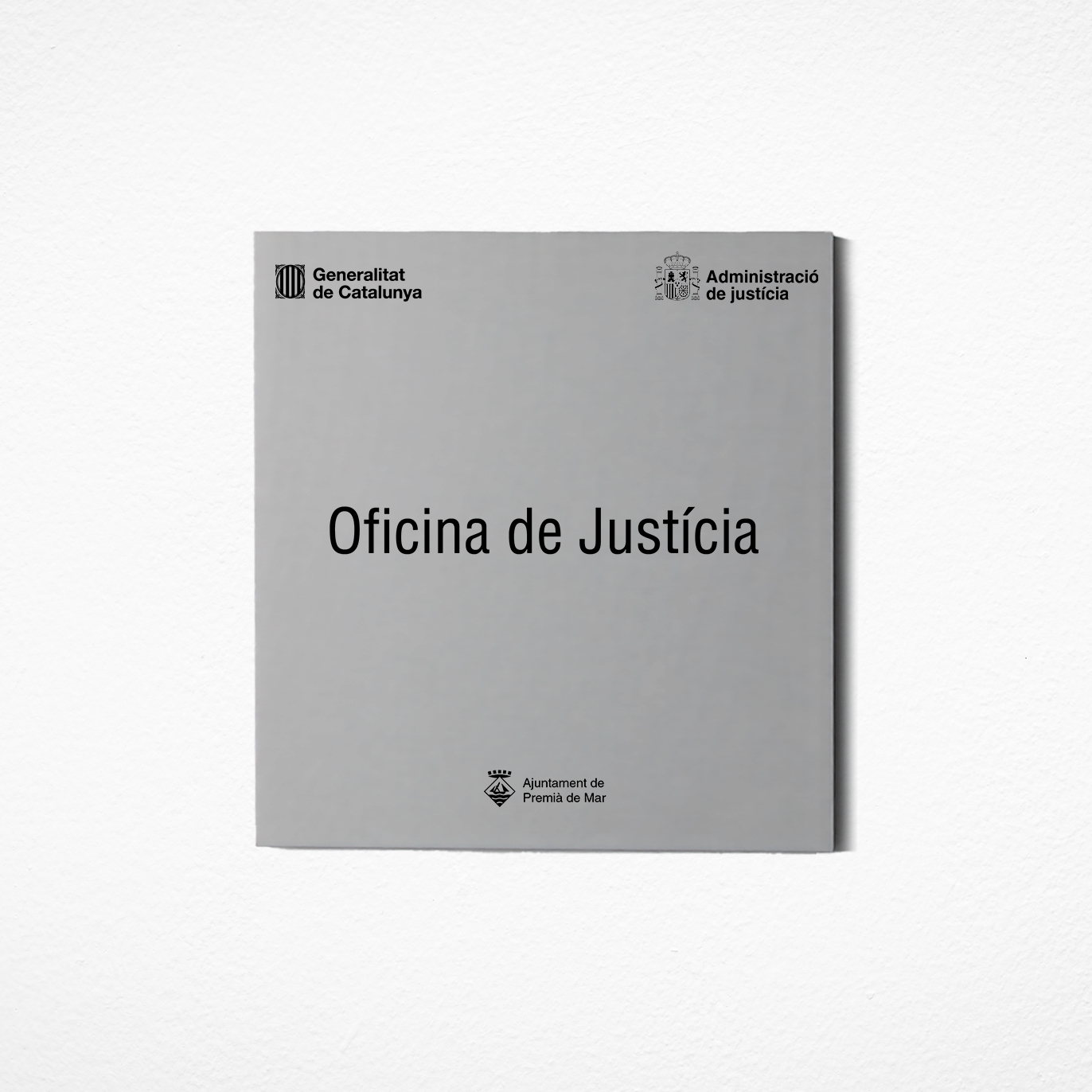 La placa oficial per a òrgans judicials de la Generalitat de Catalunya inclou tota la informació institucional requerida, assegurant una identificació clara i una jerarquia visual coherent. El nom de l’òrgan judicial es presenta en caixa centrada en tipografia Helvetica Condensed amb un cos de 130 punts, i respecte als logotips, s´han d’incloure el de la Generalitat de Catalunya, el del Departament de Justícia i, en alguns casos, l’escut de la població on es troba l’òrgan judicial. Aquesta combinació gràfica reforça l’autoritat i la proximitat institucional dels òrgans judicials.