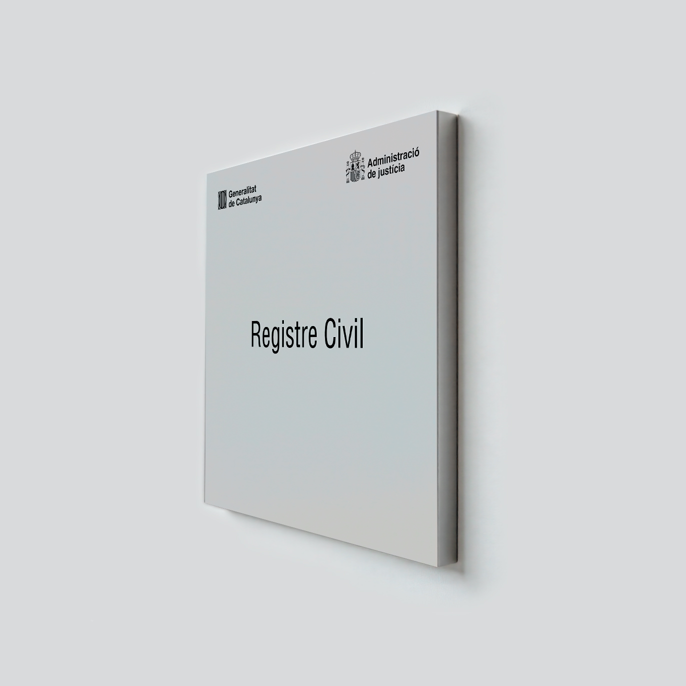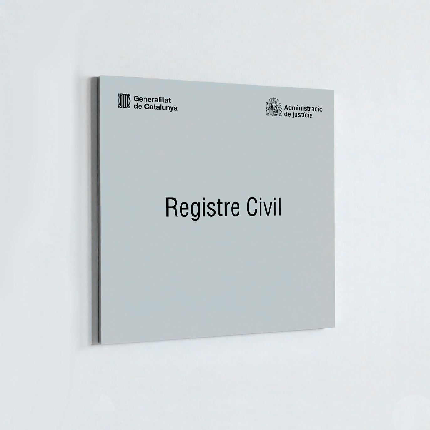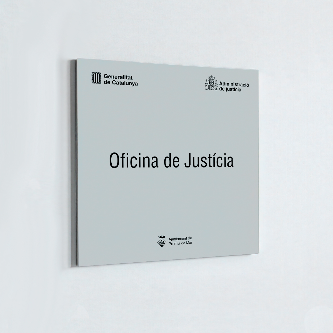 Les plaques oficials per òrgans judicials de la Generalitat de Catalunya es fabriquen en format tipus “safata”, amb una estructura metàl·lica robusta de 45 x 45 cm i un gruix de 2 cm. L’interior és buit i incorpora un suport intern en perfil tipus “L”, que garanteix una fixació segura i duradora a la paret. Aquest disseny assegura resistència i una integració estètica amb la façana dels edificis oficials.