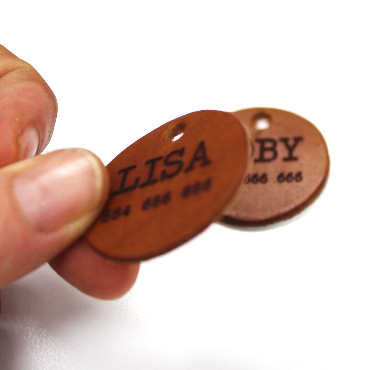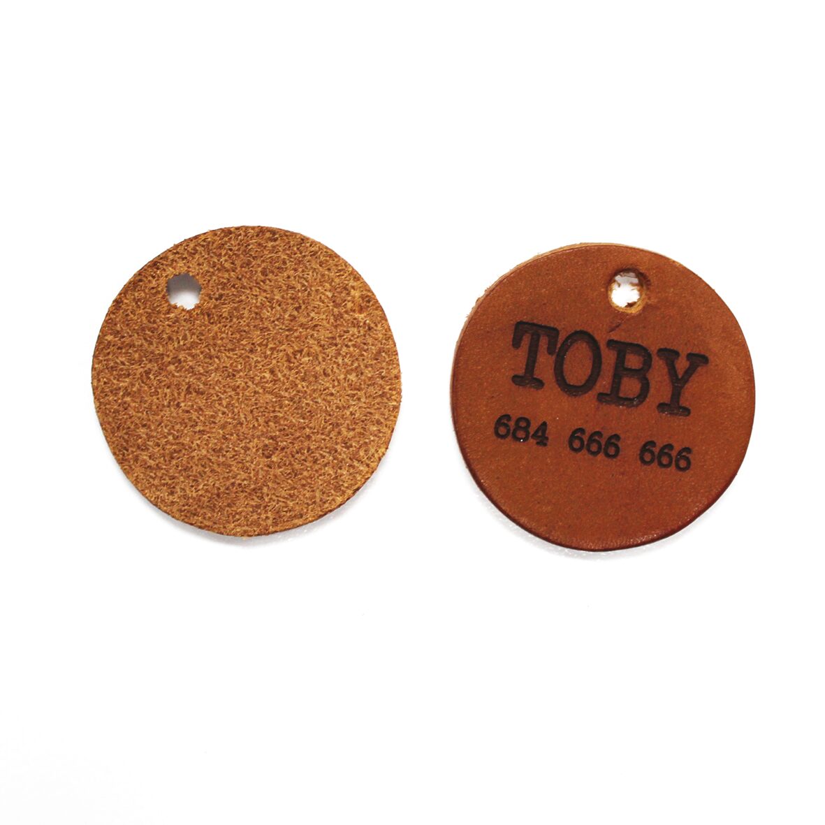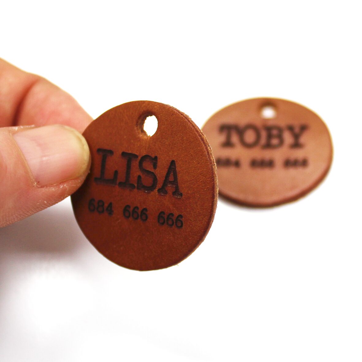 Plaquitas redondas de 3 cm. de diámetro de cuero marrón de 3,5 mm de grosor. Estas placas se graban con tecnologia láser para que el nomvre y el telefono sea indeleble. Gracias al agujero que viene en la placa, podrás fijarla a través de una anilla en el collar de tu perro y llevarlo siempre correctamente identificado.