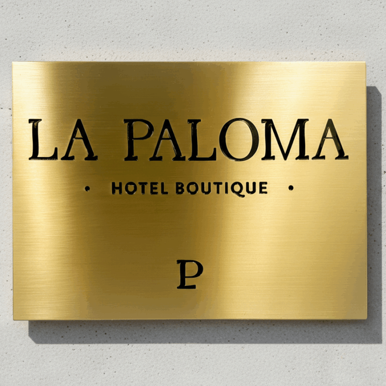 Por un lado, encontramos los rótulos metálicos grabados. Los materiales que se usan son acero inoxidable, latón y aluminio. Este tipo de rótulo es un rótulo grabado y pintado, ya que una vez se ha hecho la hendidura en el metal, ésta se rellena con pintura negra para que el contraste entre el fondo y el texto sea más vistoso y la lectura sea más sencilla.