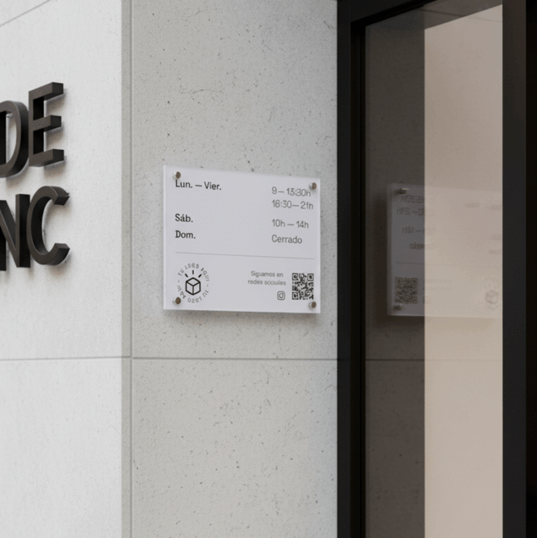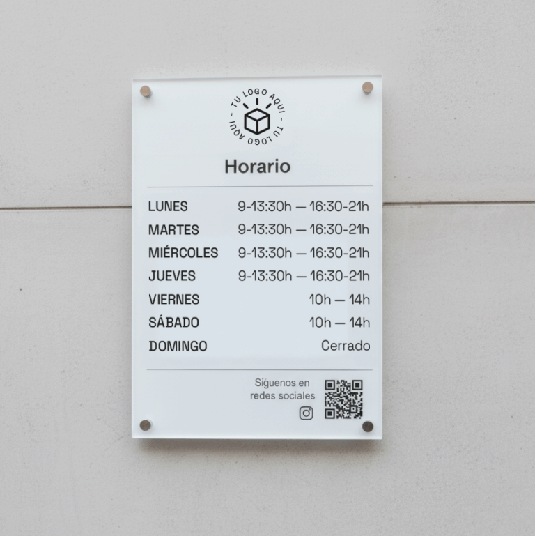 También podrás utilizar tu placa para indicar el horiro comercial de tu tienda. En los casos en que utilizamos la placa como cartel de horarios comerciales, los materiales más utilizados son el plástico bicapa y el metacrilato aunque también puedes fabricar tu placa de horario comercial en aluminio impreso.