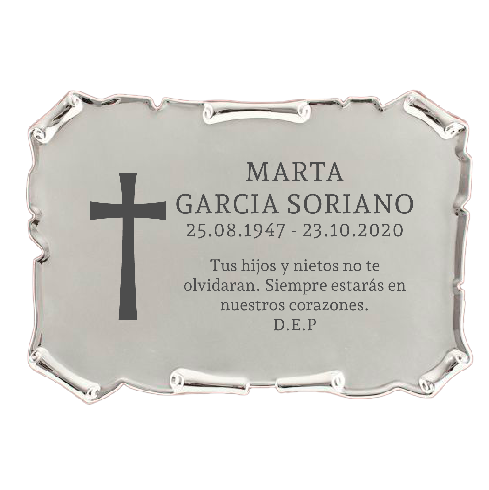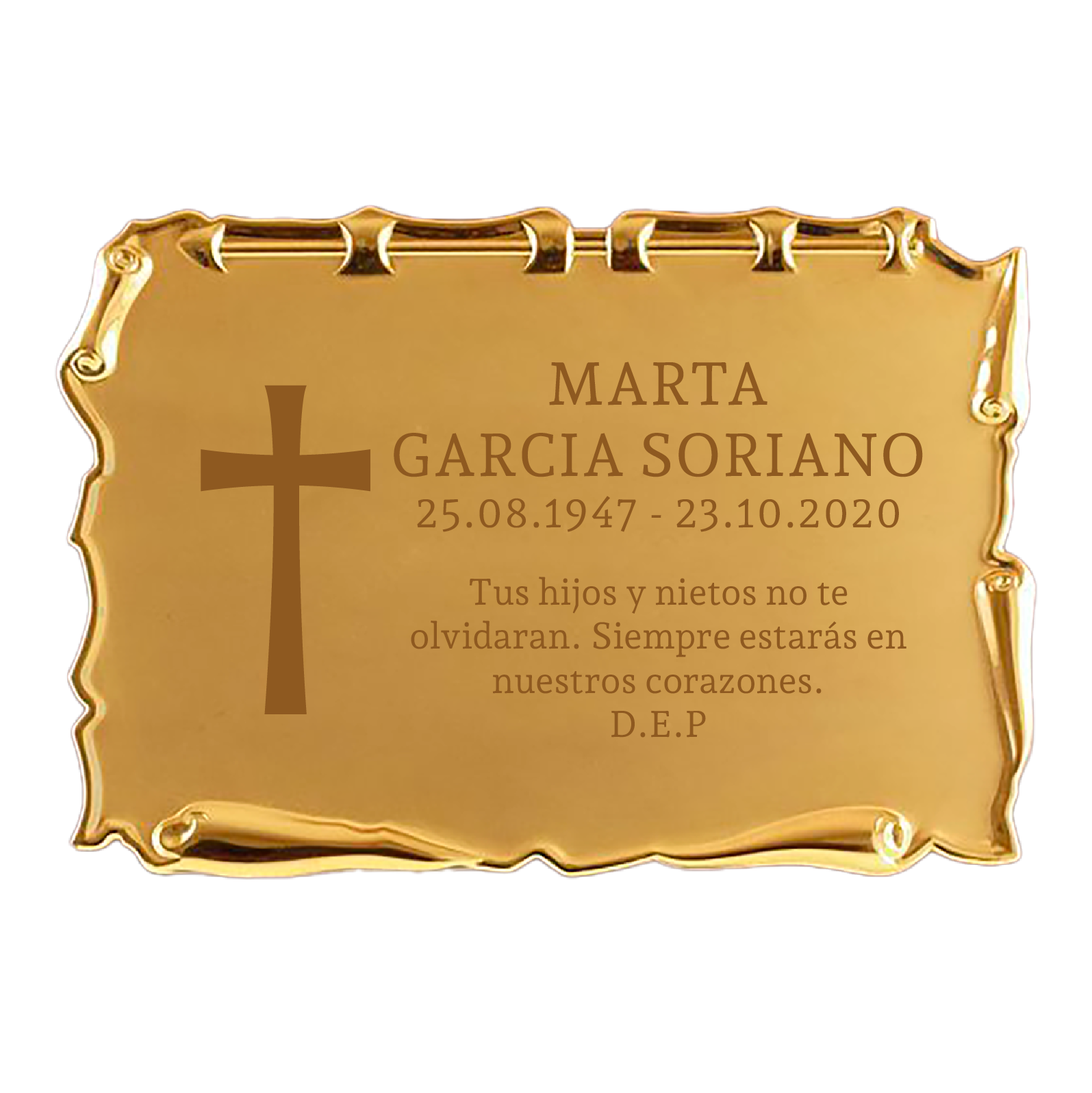 La placa funeraria Cruz Pergamino metálica es un tributo cargado de simbolismo religioso y elegancia. Su base metálica simula una lámina de pergamino, sobre la que se imprime la cruz, los nombres, fechas y una dedicatoria personalizada. Este diseño transmite serenidad, esperanza y espiritualidad, convirtiéndose en un recuerdo significativo para quienes desean honrar a sus seres queridos desde la fe.