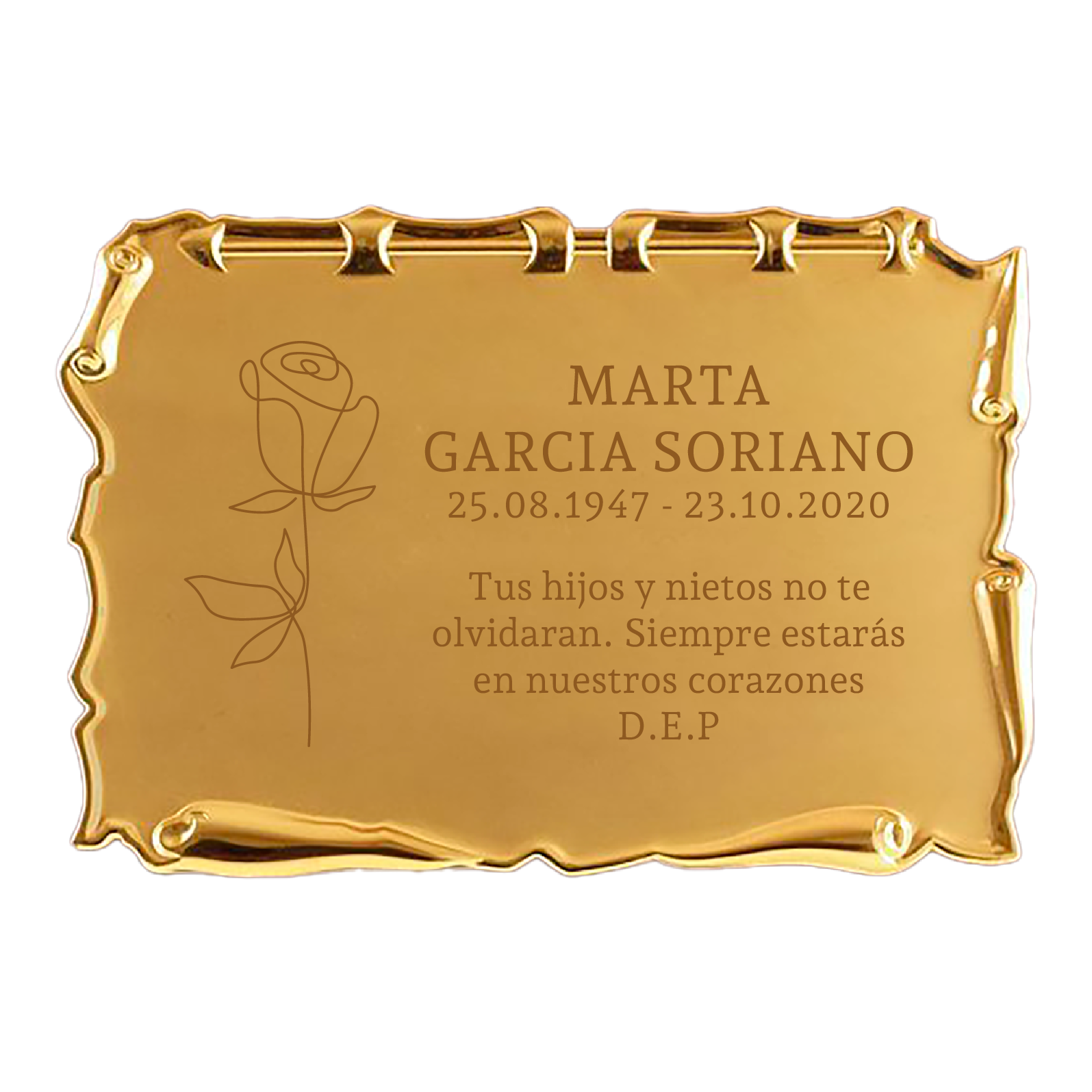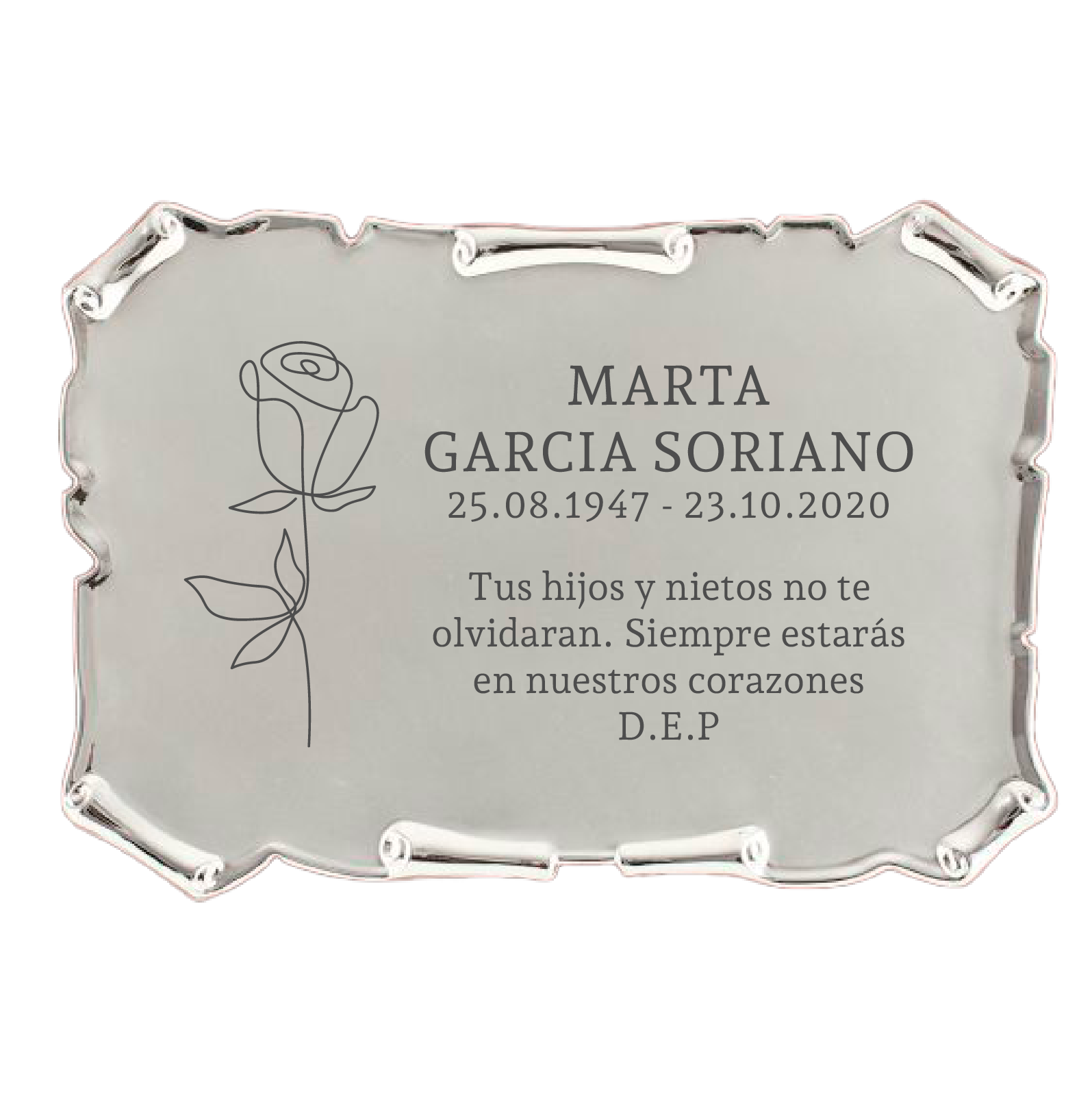 La placa funeraria Rosa Pergamino es un tributo cargado de ternura y simbolismo. Su diseño combina la elegancia de una base metálica que simula un pergamino antiguo con la imagen de una rosa, impresa junto al nombre, las fechas y la dedicatoria elegida. La rosa, tradicional emblema de amor y recuerdo eterno, aporta una nota emotiva que convierte esta placa en un homenaje íntimo y especial.