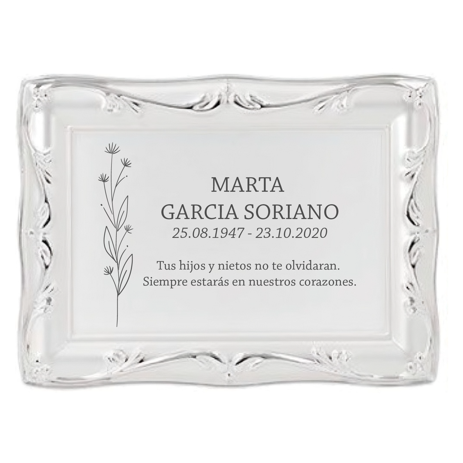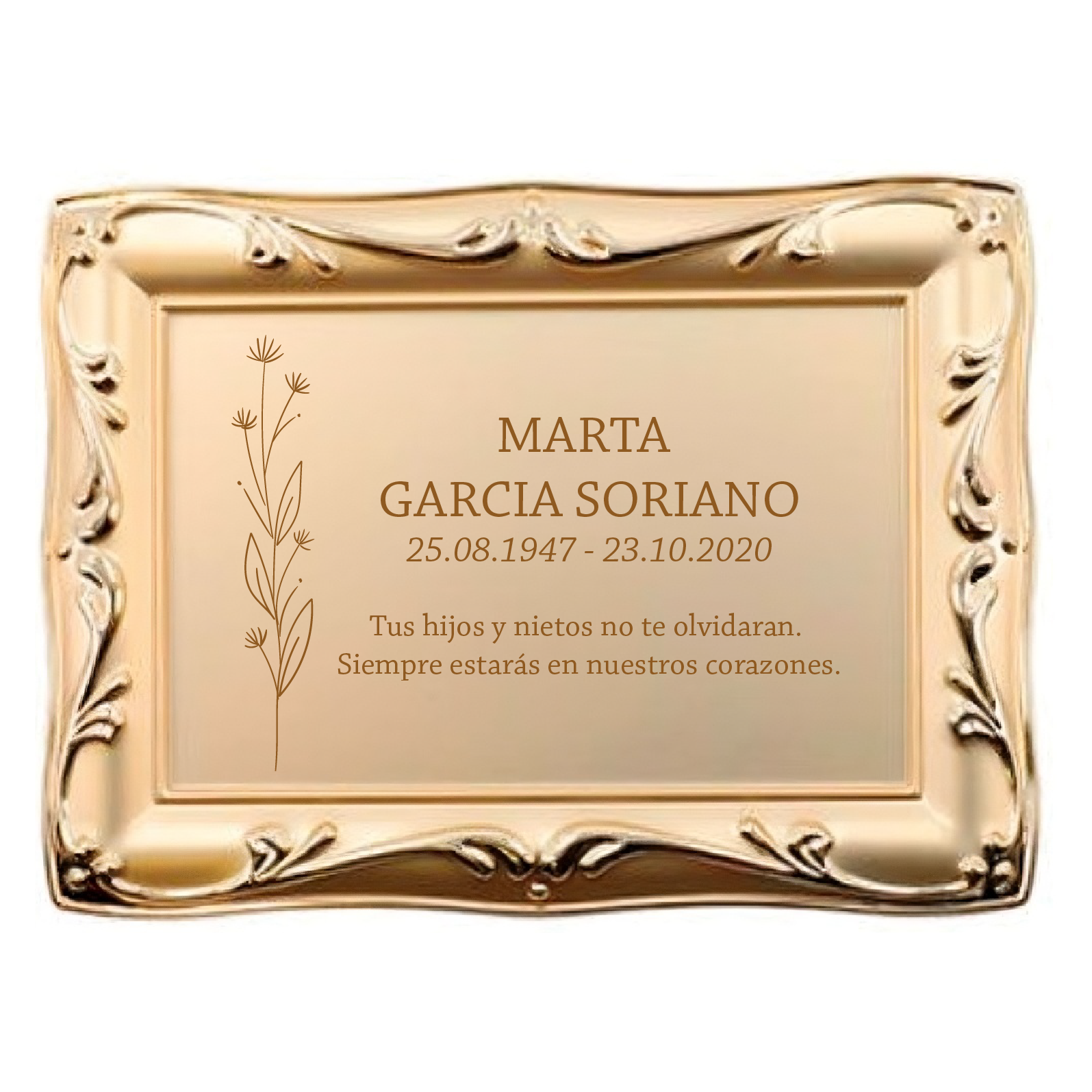 El soporte de la placa es metálico, sólido y de gran calidad, lo que garantiza firmeza y una excelente presencia visual. La personalización de los datos —nombre, fechas y dedicatoria— junto con los ornamentos vegetales se realiza mediante grabado sobre la superficie central. Este proceso genera un contraste elegante: la superficie se mantiene con un acabado mate, mientras que las zonas grabadas adquieren un brillo sutil que resalta los detalles y aporta profundidad al diseño.